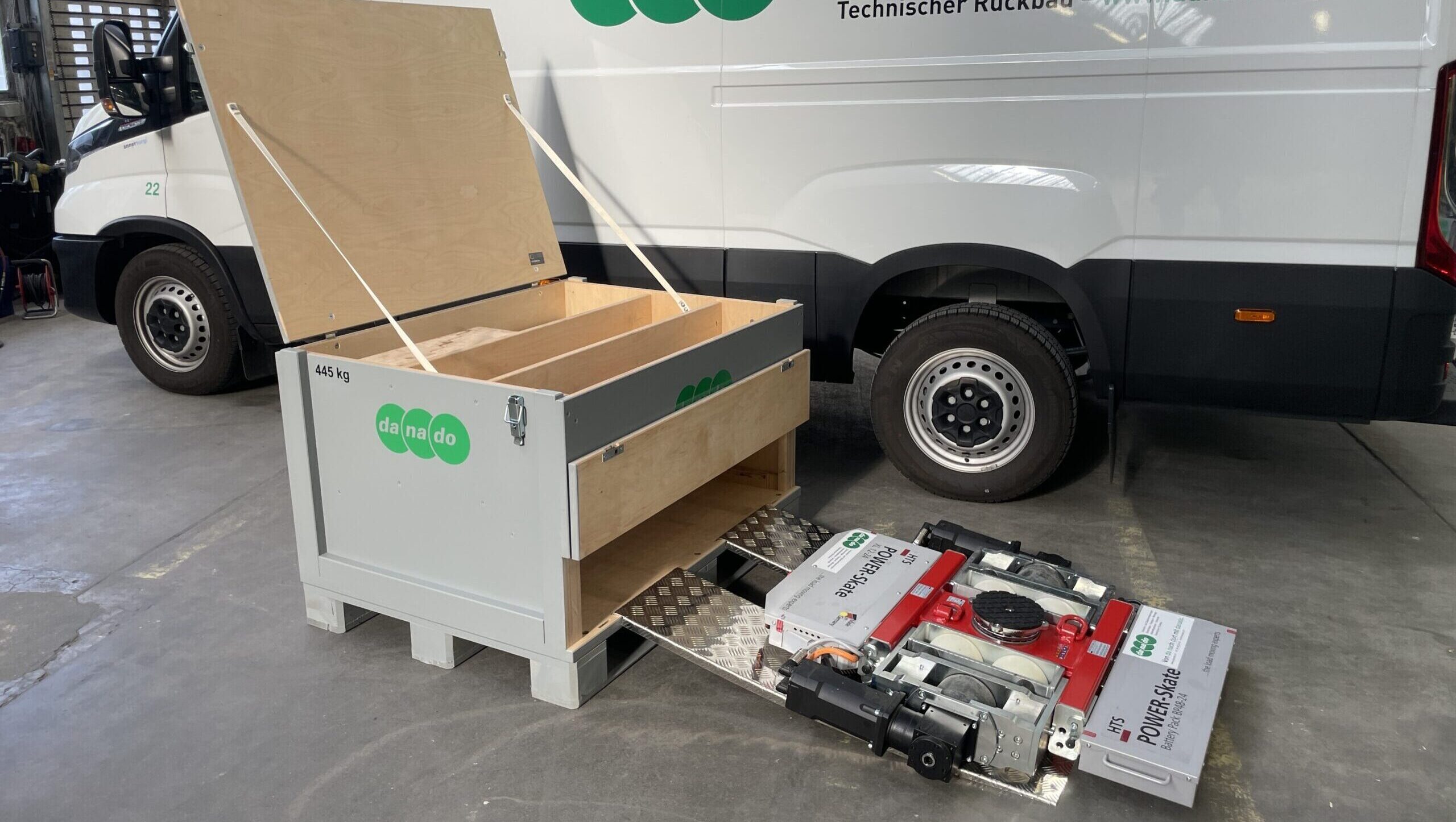 Mit unserem neuen 24 t Elektrofahrwerk sind wir noch flexibler, präziser und wendiger unterwegs. Dies alles kompakt und sauber in der eigens dafür entworfenen Transportkiste verstaut.